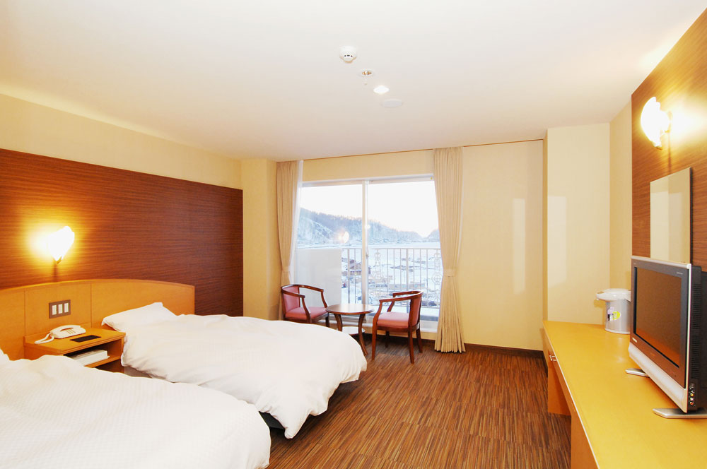 知床の海を望む、心地よいツインルーム。大きな窓から広がる景色が、夕暮れには静かに客室を染めます。